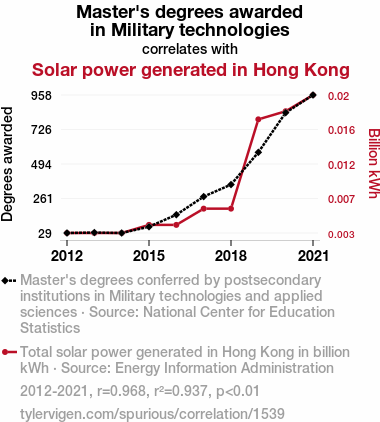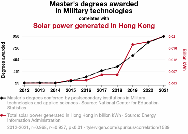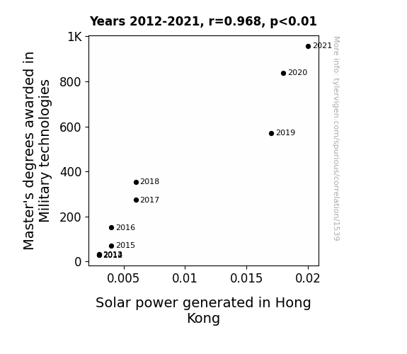 This means 93.7% of the change in the one variable (i.e., Solar power generated in Hong Kong) is predictable based on the change in the other (i.e., Master's degrees awarded in Military technologies) over the 10 years from 2012 through 2021.