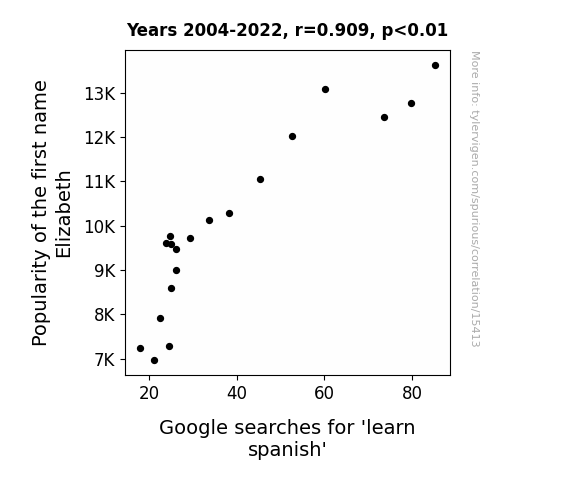 This means 82.7% of the change in the one variable (i.e., Google searches for 'learn spanish') is predictable based on the change in the other (i.e., Popularity of the first name Elizabeth) over the 19 years from 2004 through 2022.