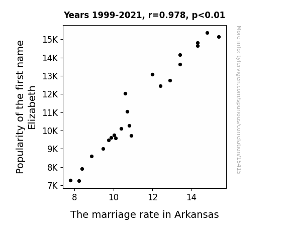 This means 95.6% of the change in the one variable (i.e., The marriage rate in Arkansas) is predictable based on the change in the other (i.e., Popularity of the first name Elizabeth) over the 23 years from 1999 through 2021.