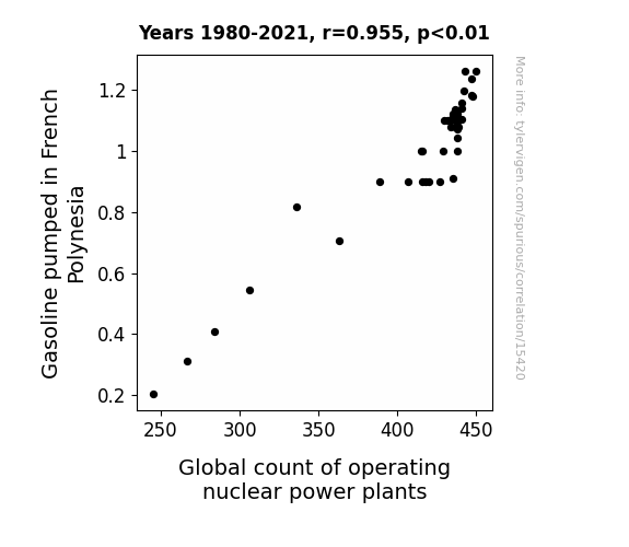 This means 91.2% of the change in the one variable (i.e., Global count of operating nuclear power plants) is predictable based on the change in the other (i.e., Gasoline pumped in French Polynesia) over the 42 years from 1980 through 2021.