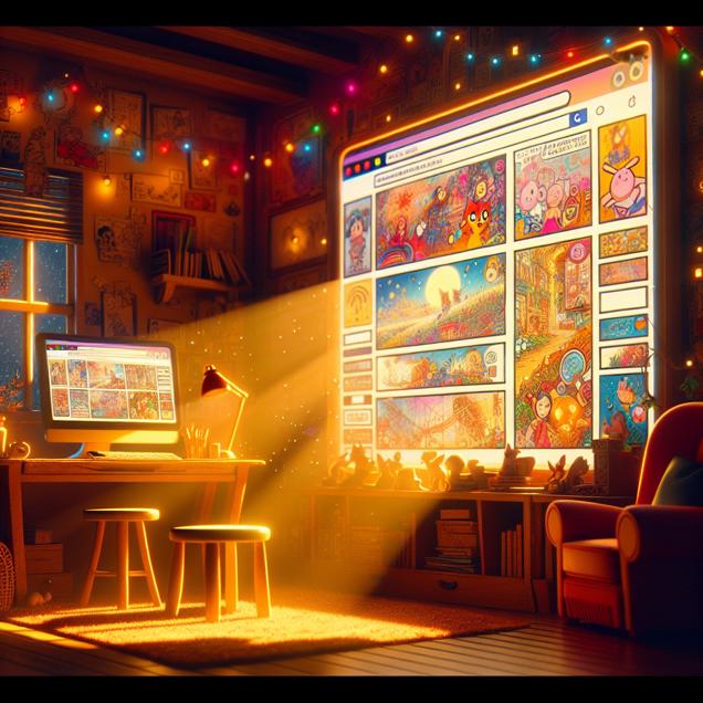 Prompt: An image that looks like it is a scene from a Disney movie, depicting a cozy living room with a computer desk at the center. On the computer, there are multiple screens displaying colorful xkcd comics related to artificial intelligence. The open browser on the computer shows the Google search results for "please clap." The room is bathed in warm, soft lighting, creating a magical and inviting atmosphere. The depiction should include only scenes, people, and objects, it should not include text or speech bubbles.