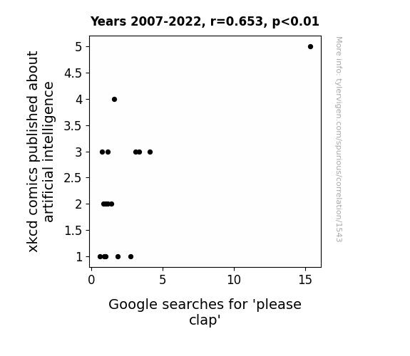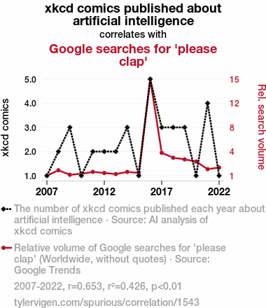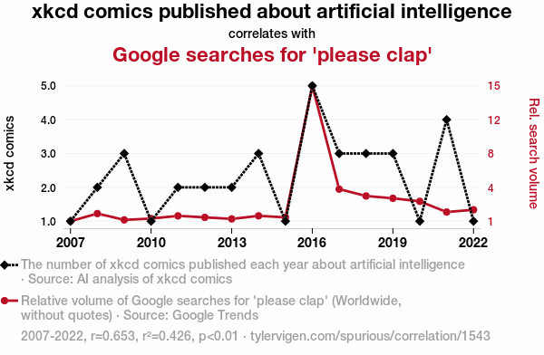 This means 42.6% of the change in the one variable (i.e., Google searches for 'please clap') is predictable based on the change in the other (i.e., xkcd comics published about artificial intelligence) over the 16 years from 2007 through 2022.