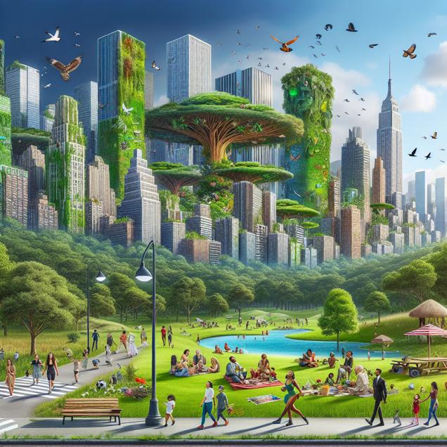 ChatGPT: Generate an image of "Erin Park" in a metropolitan city, where amidst the urban bustle, an open green sanctuary named "Erin Park" stands. The park is adorned with vibrant foliage and towering trees, evoking the lush greenery of the Brazilian Amazon. In the foreground, diverse groups of people of all ages commune, symbolizing the universal appeal of the park and the significance of preserving the Amazon's forest cover. The scene should reflect a sense of magic realism, blending the urban and natural worlds in a harmonious and mesmerizing manner.