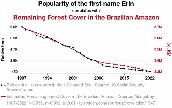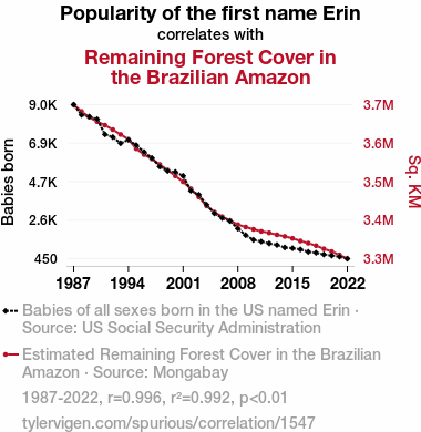 This means 99.2% of the change in the one variable (i.e., Remaining Forest Cover in the Brazilian Amazon) is predictable based on the change in the other (i.e., Popularity of the first name Erin) over the 36 years from 1987 through 2022.