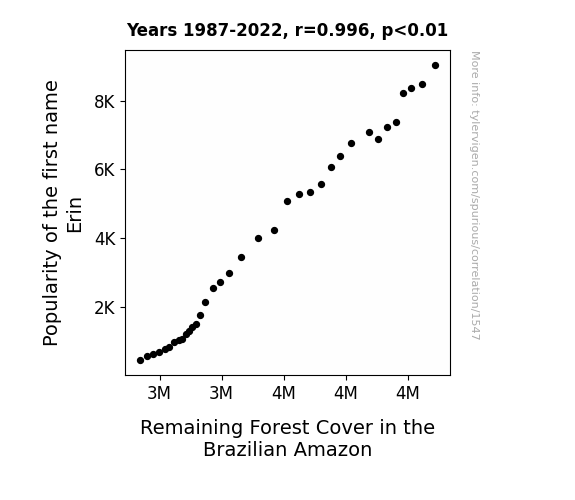 Our analysis, carried out over the period from 1987 to 2022, unveiled a correlation coefficient of 0.9959516 between the frequency of the name Erin and the extent of forest cover in the Brazilian Amazon. If there ever was a "smoking gun" in the world of ecological quirkiness, this just might be it! The strength of this correlation was so robust, it could rival the fortitude of a superhero battling supervillains.