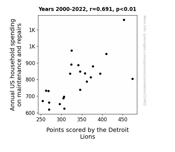 This means 47.8% of the change in the one variable (i.e., Points scored by the Detroit Lions) is predictable based on the change in the other (i.e., Annual US household spending on maintenance and repairs) over the 23 years from 2000 through 2022.