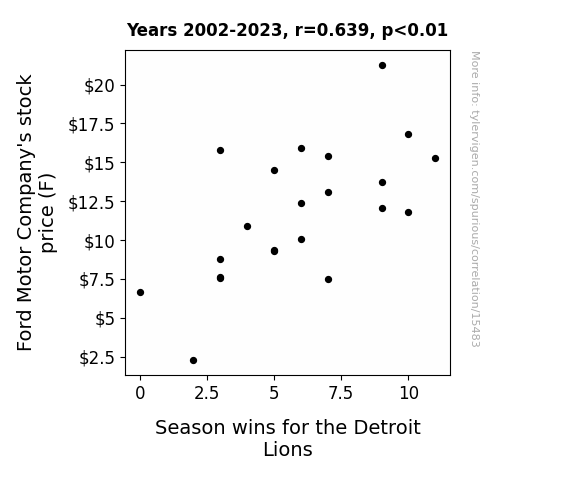 This means 40.8% of the change in the one variable (i.e., Season wins for the Detroit Lions) is predictable based on the change in the other (i.e., Ford Motor Company's stock price (F)) over the 22 years from 2002 through 2023.