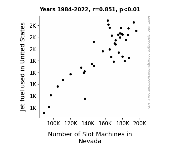 This means 72.4% of the change in the one variable (i.e., Number of Slot Machines in Nevada) is predictable based on the change in the other (i.e., Jet fuel used in United States) over the 39 years from 1984 through 2022.