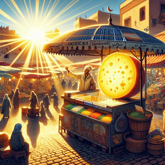 ChatGPT: Generate an image of a bustling Moroccan marketplace on a sunny day, with a vendor proudly displaying a wheel of glowing American cheese in front of his high-tech, solar-powered stall. The warm sunlight streams through the bustling market, casting vibrant shadows and illuminating the colors of the diverse goods on display, while powering the solar panels that symbolize the intersection of American cheese consumption and solar power in Morocco.