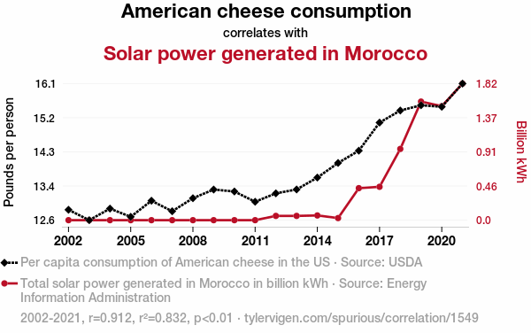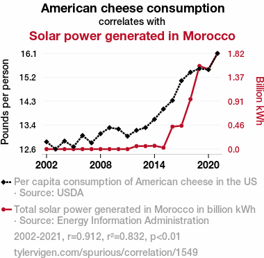 - The spurious research paper: Shedding Light on Solar-Powered Cheese: An Analysis of American Cheese Consumption and Solar Power Generation in Morocco
