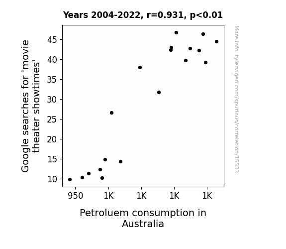 This means 86.6% of the change in the one variable (i.e., Petroluem consumption in Australia) is predictable based on the change in the other (i.e., Google searches for 'movie theater showtimes') over the 19 years from 2004 through 2022.