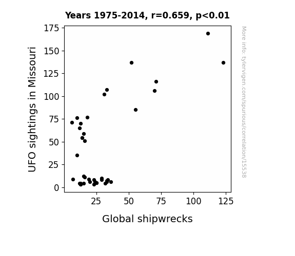 This means 43.4% of the change in the one variable (i.e., Global shipwrecks ) is predictable based on the change in the other (i.e., UFO sightings in Missouri) over the 40 years from 1975 through 2014.