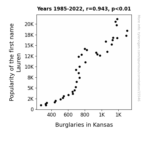 This means 88.9% of the change in the one variable (i.e., Burglaries in Kansas) is predictable based on the change in the other (i.e., Popularity of the first name Lauren) over the 38 years from 1985 through 2022.