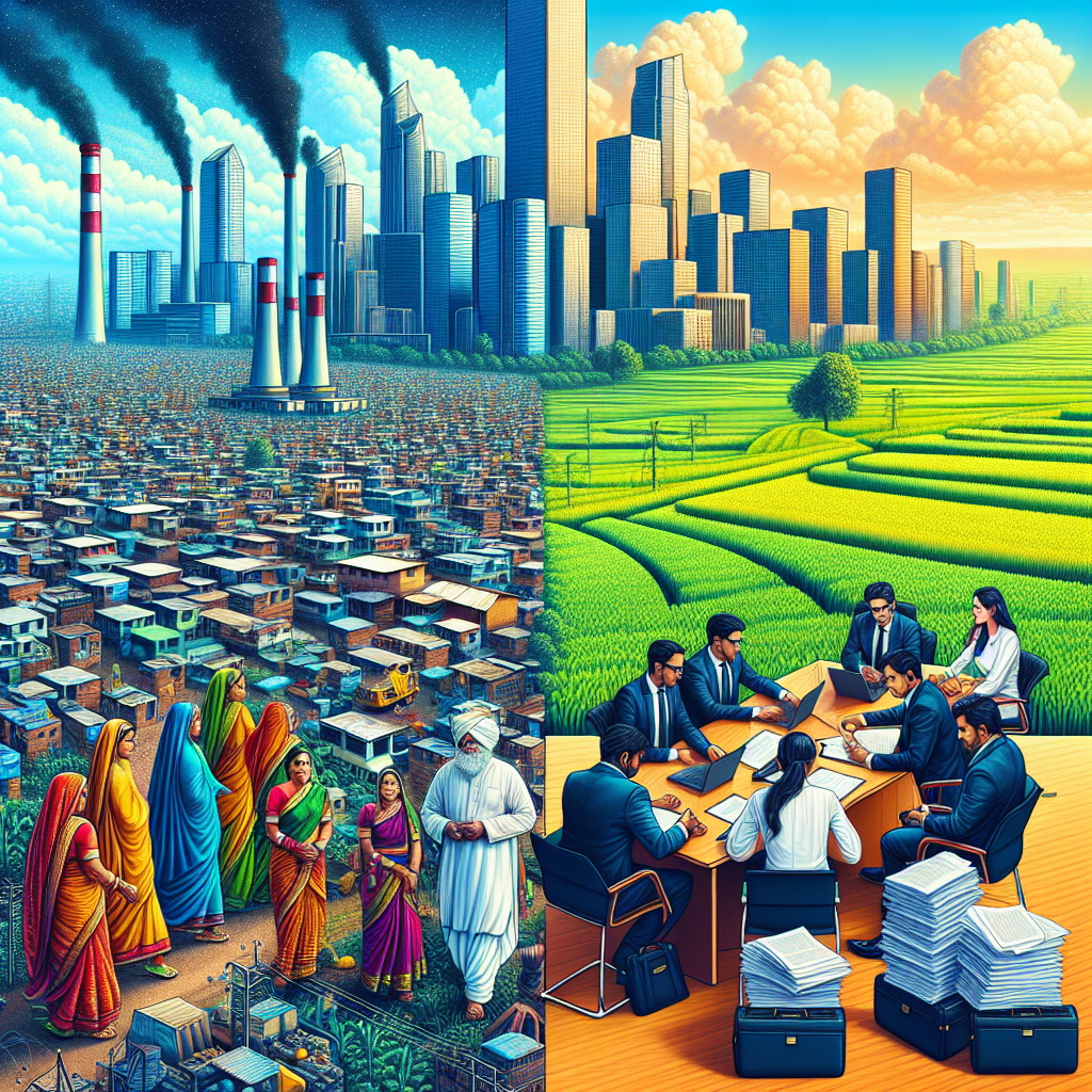 Prompt: Title: Transcontinental Tales Description: Create an image with the style of data cyber art depicting two contrasting scenes. In one, capture the vibrant ambiance of a bustling Indian city, focusing on a towering biomass power plant surrounded by lush green fields of crops. In the other, depict a group of lawyers in a modern office building in the United States, deeply engrossed in a conference amidst scattered legal documents and files. Ensure the contrast between the two settings is vivid and intriguing. The depiction should include only scenes, people, and objects, it should not include text or speech bubbles.