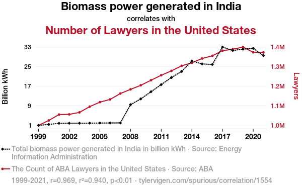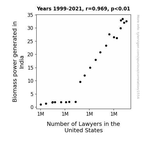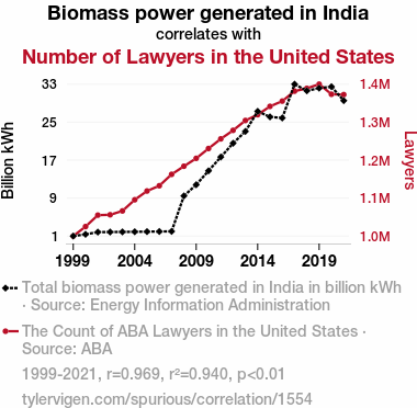 This means 94% of the change in the one variable (i.e., Number of Lawyers in the United States) is predictable based on the change in the other (i.e., Biomass power generated in India) over the 23 years from 1999 through 2021.