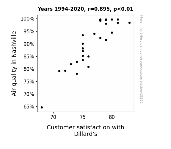 This means 80.1% of the change in the one variable (i.e., Customer satisfaction with Dillard's) is predictable based on the change in the other (i.e., Air quality in Nashville) over the 27 years from 1994 through 2020.