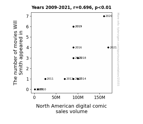 This means 48.4% of the change in the one variable (i.e., North American digital comic sales volume) is predictable based on the change in the other (i.e., The number of movies Will Smith appeared in) over the 13 years from 2009 through 2021.