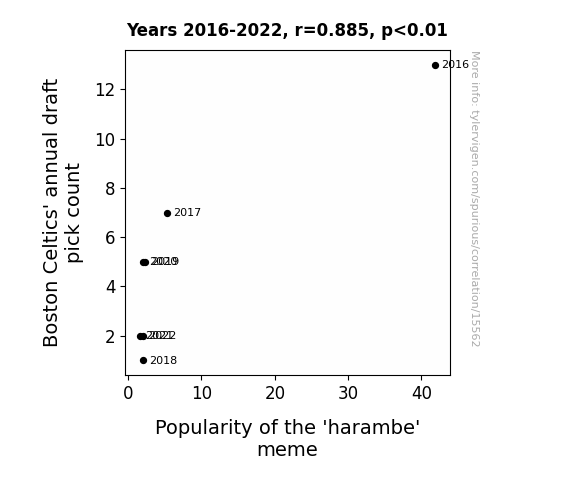 This means 78.4% of the change in the one variable (i.e., Popularity of the 'harambe' meme) is predictable based on the change in the other (i.e., Boston Celtics' annual draft pick count) over the 7 years from 2016 through 2022.
