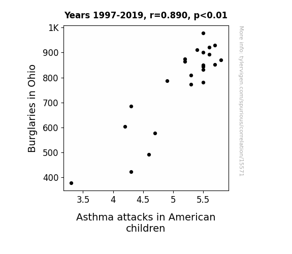 This means 79.2% of the change in the one variable (i.e., Asthma attacks in American children) is predictable based on the change in the other (i.e., Burglaries in Ohio) over the 23 years from 1997 through 2019.