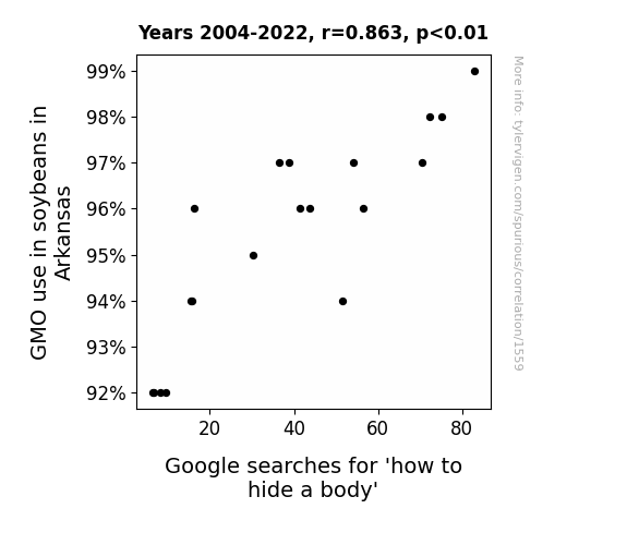 - The spurious research paper: The Soybean Surge: Unearthing the Connection Between GMOs and Googling 'How to Hide a Body'