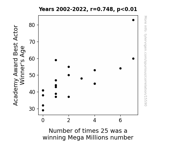 This means 55.9% of the change in the one variable (i.e., Number of times 25 was a winning Mega Millions number) is predictable based on the change in the other (i.e., Academy Award Best Actor Winner's Age) over the 21 years from 2002 through 2022.