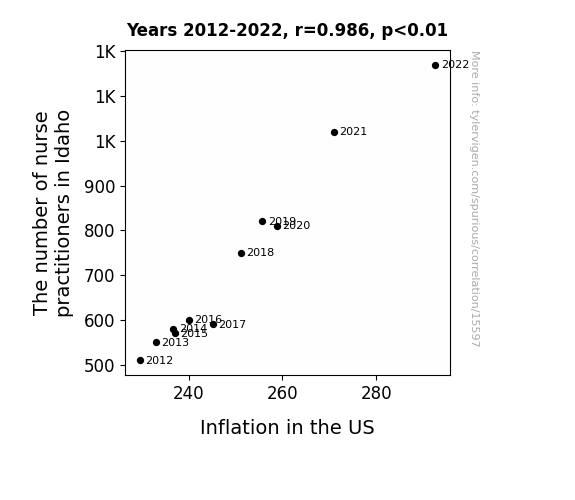 This means 97.1% of the change in the one variable (i.e., Inflation in the US) is predictable based on the change in the other (i.e., The number of nurse practitioners in Idaho) over the 11 years from 2012 through 2022.