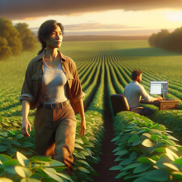 Prompt: [ A photo-realistic image ] Show a farmer in Arkansas walking through a vast field of lush, green soybean plants, with some of them featuring large genetically modified traits. Looming in the background and slightly blurred, a person sits at a computer, frantically typing "how to hide a body" into the Google search bar. Ensure details such as the farmer's rugged work attire, the sprawling field with varying heights of soybean plants, and the intense focus in the person's eyes at the computer. The lighting should capture the warm, late afternoon glow of the field and the cool, sterile glow of the computer screen. The depiction should include only scenes, people, and objects, it should not include text or speech bubbles.