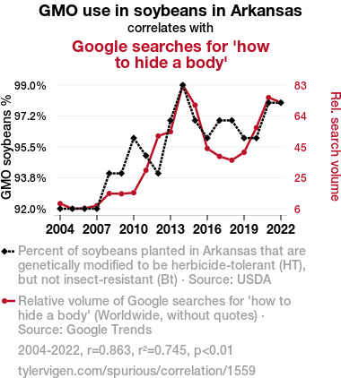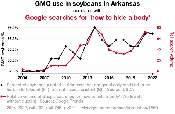 - The spurious research paper: The Soybean Surge: Unearthing the Connection Between GMOs and Googling 'How to Hide a Body'