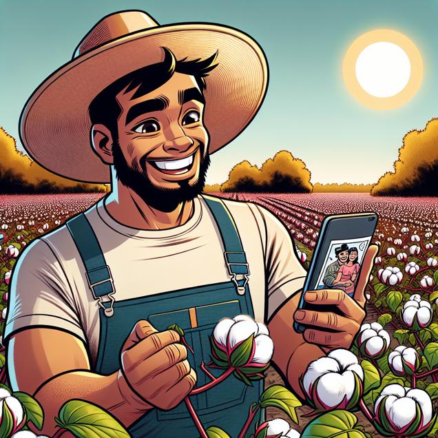 Prompt: [ Cute 2D animation ] Create an image of a North Carolina cotton field, with a smiling farmer wearing a wide-brimmed hat and overalls peacefully tending to rows of vibrant GMO cotton plants. He's holding a smartphone and reading an xkcd comic about romance, which makes him chuckle. The sun shines brightly in the sky, casting a warm glow over the field, and the gentle breeze carries the scent of blooming cotton flowers as they sway in the wind. The depiction should include only scenes, people, and objects, it should not include text or speech bubbles.