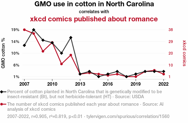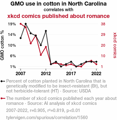 - The spurious research paper: Genetically Modified Romance: Uncovering the Cotton Connection Between GMO Use in North Carolina and xkcd Comics