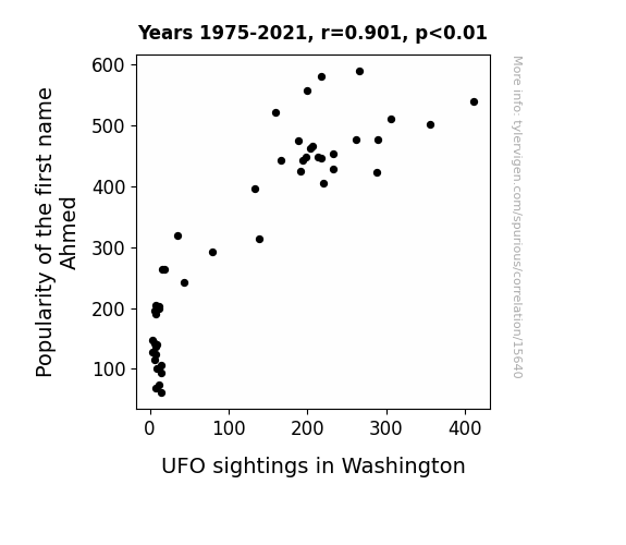 This means 81.2% of the change in the one variable (i.e., UFO sightings in Washington) is predictable based on the change in the other (i.e., Popularity of the first name Ahmed) over the 47 years from 1975 through 2021.