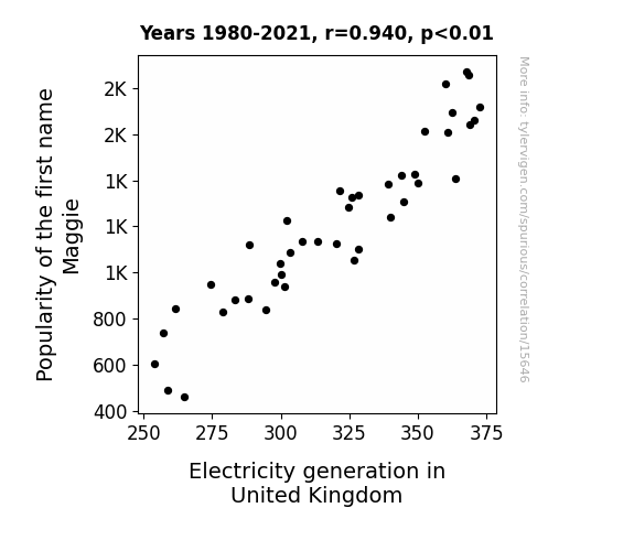 This means 88.3% of the change in the one variable (i.e., Electricity generation in United Kingdom) is predictable based on the change in the other (i.e., Popularity of the first name Maggie) over the 42 years from 1980 through 2021.