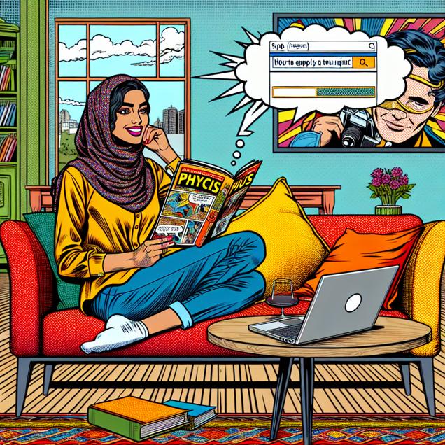 User prompt: Please respond with an image generation prompt that would be likely to create an interesting visual using DALLE-3, using the following style: [ Pop art ] and depicting this scene: In a cozy living room, a person is sitting on a comfortable couch reading an xkcd comic book about physics, while at the same time, on the coffee table, a laptop is open displaying a Google search for "how to apply a tourniquet" as the person is learning first aid techniques. Keep the visual depiction simple. Do not include any words or speech bubbles.