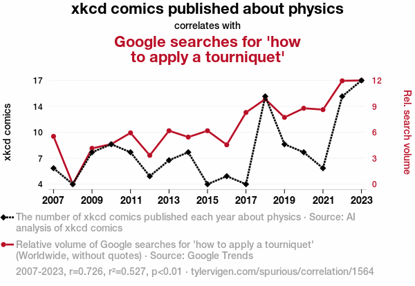 xkcd comics, physics humor, Google searches, tourniquet application, correlation, humor and human behavior, AI analysis, dataset analysis, emergency medical procedures, first-aid skills, web search behavior, quirky humor influences, human behavior, physics-related mishap