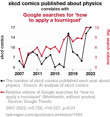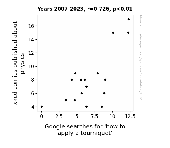 - The spurious research paper: The Physics of Funny: Exploring the Correlation Between xkcd Comics and Queries for 'How to Apply a Tourniquet'