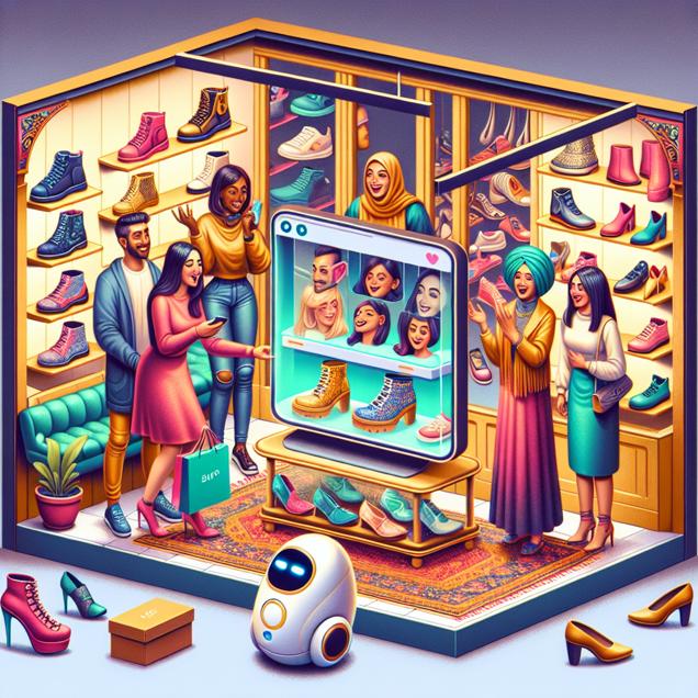 Prompt: Generate an image of a cozy shoe store with a vibrant cyber folk aesthetic. Within the store, several well-dressed individuals are busy browsing the latest shoe styles, engaged in lively conversations, and sharing laughter. A small, friendly robot with a screen emitting amusing xkcd comics related to artificial intelligence is rolling by, capturing the attention of the customers and the salesperson. The scene effortlessly fuses the warmth of a shoe shopping experience with the humor of AI comics, all within the unique cyber folk style. The depiction should include only scenes, people, and objects, it should not include text or speech bubbles.