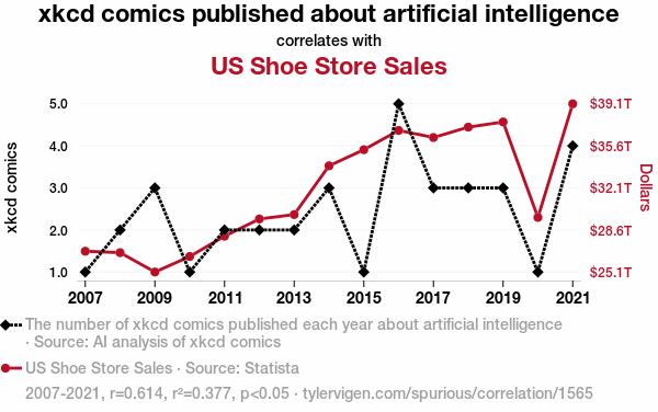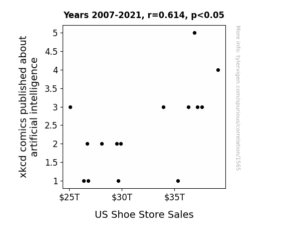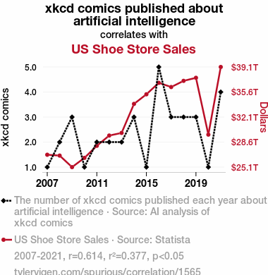 - The spurious research paper: Laughing Our Way to Insights: The Connection Between xkcd Comics on Artificial Intelligence and US Shoe Store Sales