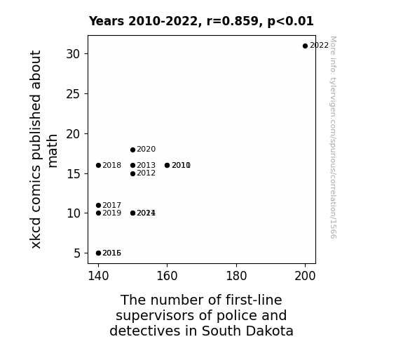The analysis of the data spanning the years 2010 to 2022 revealed a noteworthy correlation between the number of xkcd comics related to mathematics and the number of first-line supervisors of police and detectives in South Dakota. The correlation coefficient was calculated to be 0.8594221, with an r-squared value of 0.7386063 and p < 0.01. This robust correlation coefficient suggests a strong positive relationship between the two variables, akin to finding a rare antique in a thrift store – surprising, improbable, and likely to raise a few eyebrows.