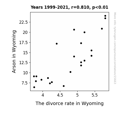 This means 65.6% of the change in the one variable (i.e., The divorce rate in Wyoming) is predictable based on the change in the other (i.e., Arson in Wyoming) over the 23 years from 1999 through 2021.