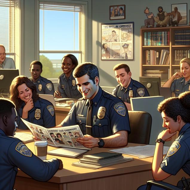 ChatGPT: In a cozy South Dakota police department office, a first-line supervisor chuckles while reading an xkcd comic about math on their computer, as a group of detectives huddle around to solve a complex equation on a whiteboard.