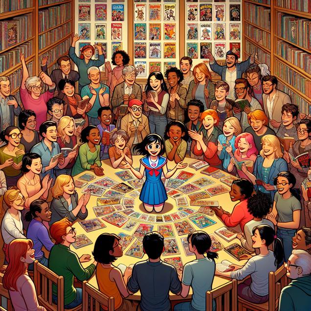User prompt: Please respond with an image generation prompt that would be likely to create an interesting visual using DALLE-3, using the following style: [ Cute 2D animation ] and depicting this scene: In a bustling library, a group of enthusiastic readers gather around a display of xkcd comics about literature, eagerly discussing their favorite strips. Among them stands a cheerful young girl named Addie, who is surrounded by a circle of friends and admirers, all clamoring for her attention. They excitedly chat about the comics as Addie beams with delight, clearly reveling in her popularity. Keep the visual depiction simple. Do not include any words or speech bubbles.