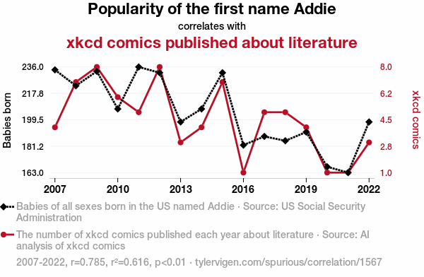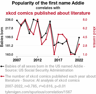 User prompt: Please provide potential search keywords for a paper titled Addie's Popularity and xkcd Comics: A Comical Correlation with an abstract of In this paper, we attempt to bring some levity to the world of academic research by exploring the amusing correlation between the popularity of the first name "Addie" and the xkcd comics that hilariously delve into the world of literature. Employing data from the US Social Security Administration and employing AI analysis of xkcd comics, we set out to answer the pressing question: Is there a whimsical connection between the frequency of the name "Addie" and the occurrence of xkcd comics related to literature? With a correlation coefficient of 0.7850936 and a p-value less than 0.01 for the period from 2007 to 2022, our findings reveal a statistically significant and amusing link between the two. Prepare to be tickled by the unexpected twist as we present the hilariously surprising results of this quirky investigation.