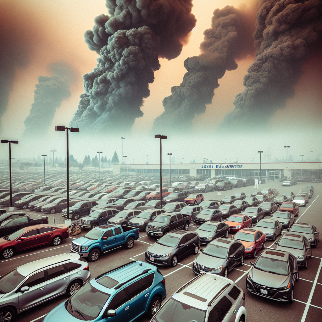 Prompt: Generate an image of a smoggy day in Kennewick, Washington, where a line of cars is waiting for recall service at a local dealership. The haze of the sky should contribute to the concerns about air quality, giving a sense of the less than ideal environmental conditions in the city. The cars should be seen waiting in line against the backdrop of the hazy, polluted sky, creating a visually striking depiction of the less than ideal air quality in Kennewick. The depiction should include only scenes, people, and objects, it should not include text or speech bubbles.