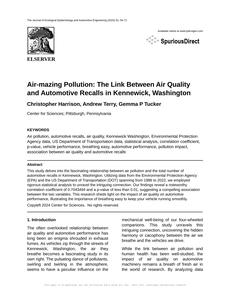 User prompt: Please provide potential search keywords for a paper titled Air-mazing Pollution: The Link Between Air Quality and Automotive Recalls in Kennewick, Washington with an abstract of This study delves into the fascinating relationship between air pollution and the total number of automotive recalls in Kennewick, Washington. Utilizing data from the Environmental Protection Agency (EPA) and the US Department of Transportation (DOT) spanning from 1986 to 2022, we employed rigorous statistical analysis to unravel the intriguing connection. Our findings reveal a noteworthy correlation coefficient of 0.7043494 and a p-value of less than 0.01, suggesting a compelling association between the two variables. This research sheds light on the impact of air quality on automotive performance, illustrating the importance of breathing easy to keep your vehicle running smoothly.