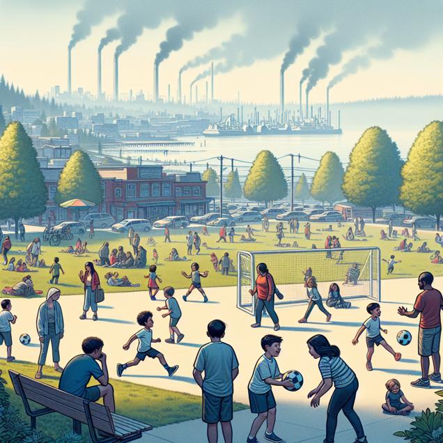 ChatGPT: In Bremerton, Washington, a bustling city park is filled with families enjoying a sunny day. Among them, a group of kids playfully kicks around a soccer ball, and the name "Elyse" can be heard being called out by friends. However, in the distance, the sky appears hazy with smog, indicating less than ideal air quality.