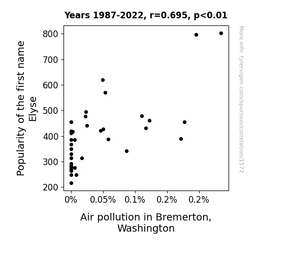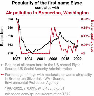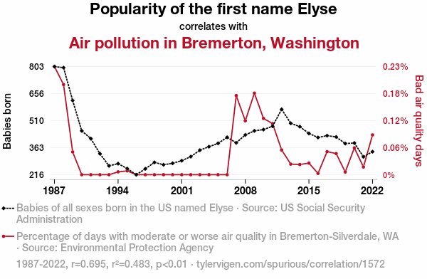 - The spurious research paper: The Elyse Effect: A Whimsical Exploration of the Correlation Between the Popularity of the Name Elyse and Air Quality in Bremerton, Washington