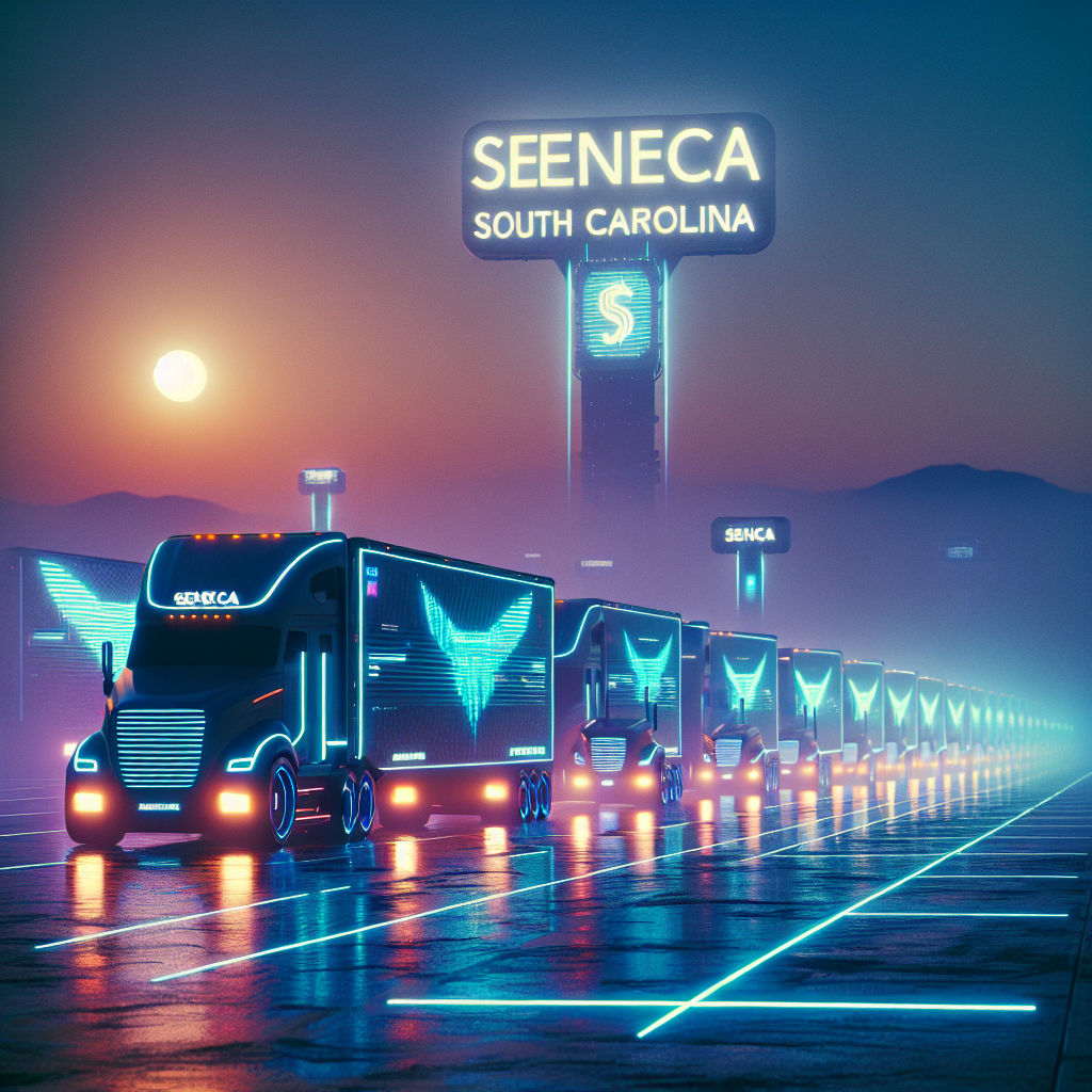 Prompt: Generate an image of a futuristic, cyberpunk-style Seneca, South Carolina, with a thick smog engulfing the town. In the foreground, a lineup of sleek, high-tech delivery trucks is visible, their sides adorned with holographic logos, ready to transport a large number of physical albums. The scene should have a cool-toned color palette with neon accents and an overall digital, futuristic vibe. The depiction should include only scenes, people, and objects, it should not include text or speech bubbles.
