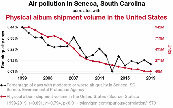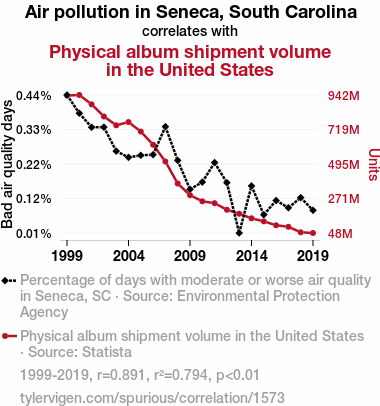 - The spurious research paper: The Melodic Hoedown of Pollution: A Correlation Between Air Pollution in Seneca, South Carolina, and Physical Album Shipment Volume in the United States