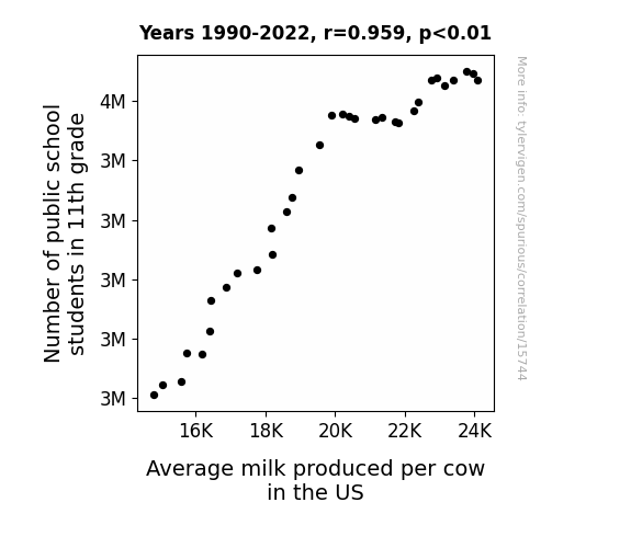 This means 92% of the change in the one variable (i.e., Average milk produced per cow in the US) is predictable based on the change in the other (i.e., Number of public school students in 11th grade) over the 33 years from 1990 through 2022.