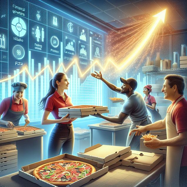 ChatGPT: In the scene, a Domino's Pizza delivery driver is handing a pizza box to a production clerk in an Idaho pizza kitchen. Earnings per share figures are displayed on a glowing digital screen in the background, indicating strong financial performance. The clerks are busy planning and expediting orders, while the aroma of freshly baked pizzas fills the air.